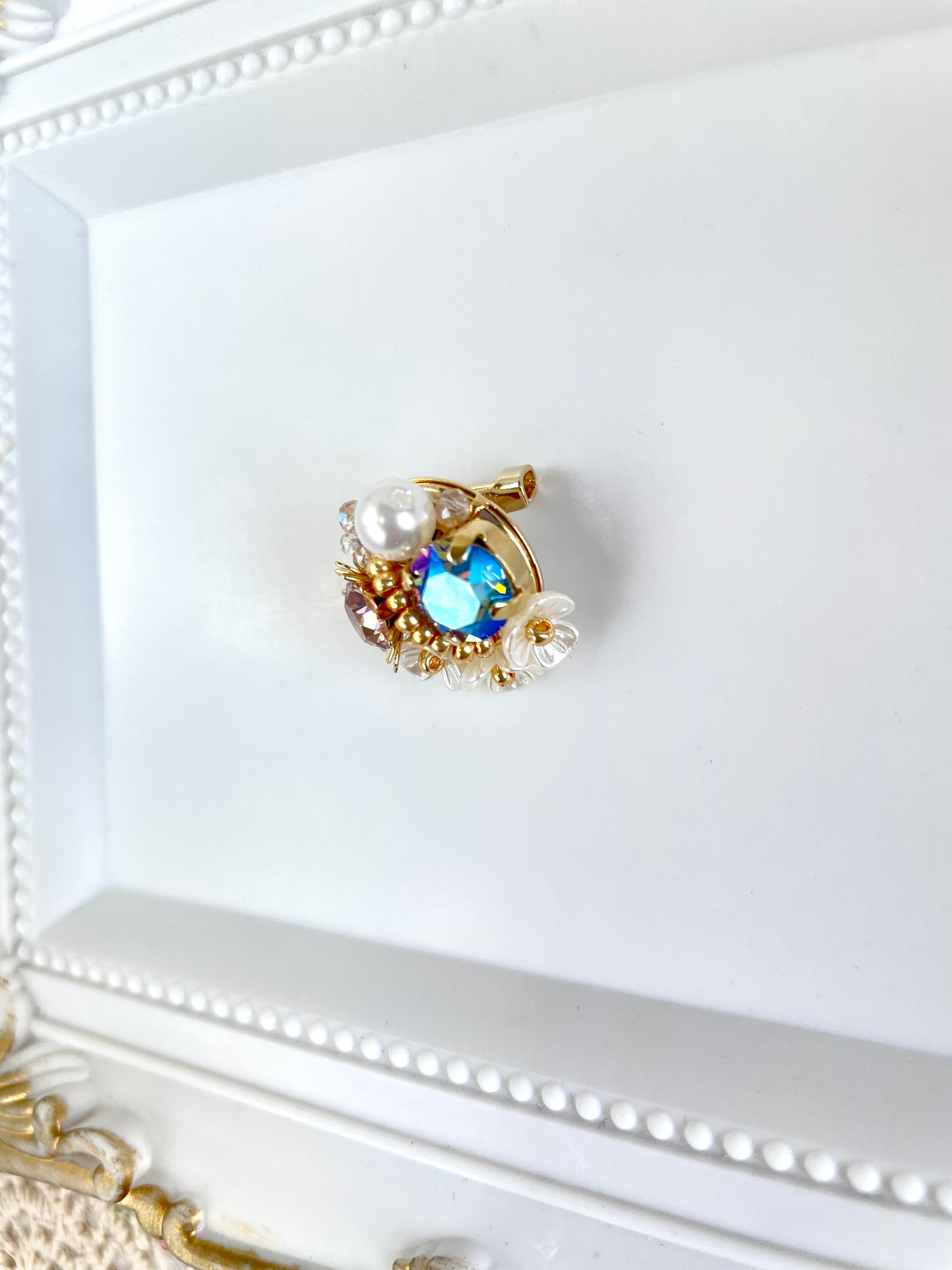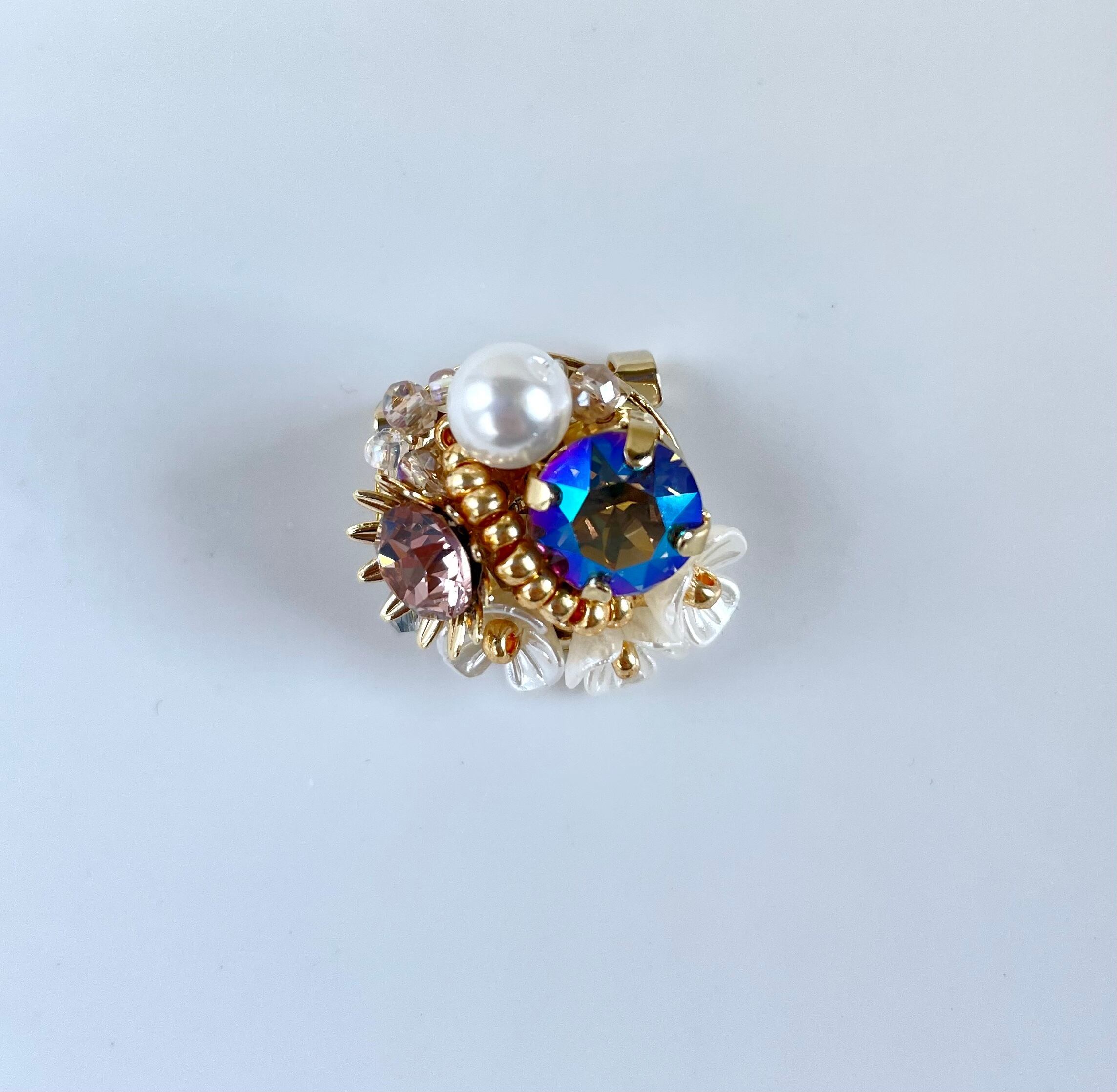 紫色と濃いブルーが複雑に混ざり、絶妙な輝きを生み出す高級クリスタルガラスのビジューに、ビンテージピンクのビジューを組み合わせて、大人可愛くしました。