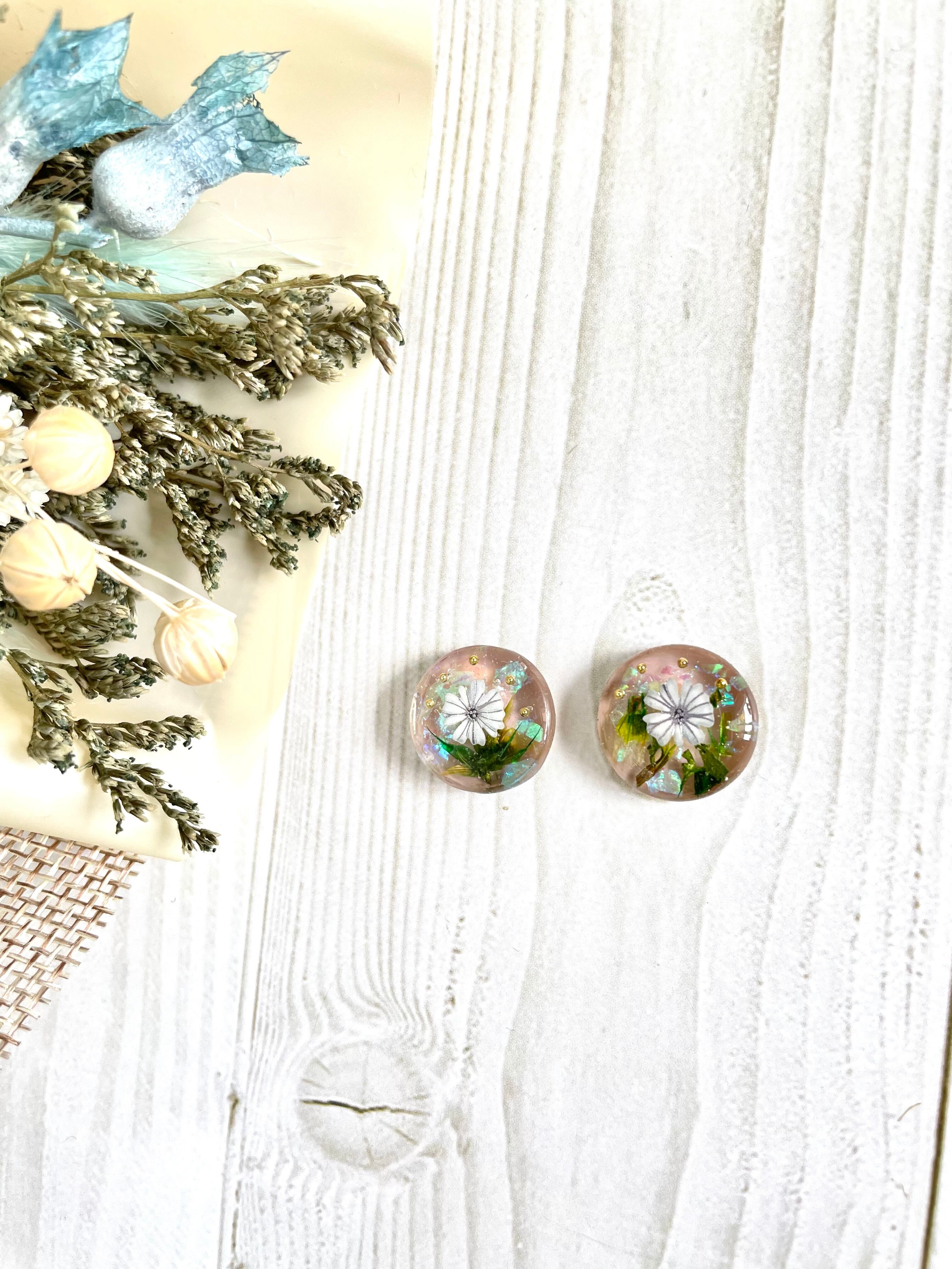 白いお花とドライリーフを封入した、ミルクココア色の可愛いイヤーアクセサリーです。レジンで丁寧に仕上げました。