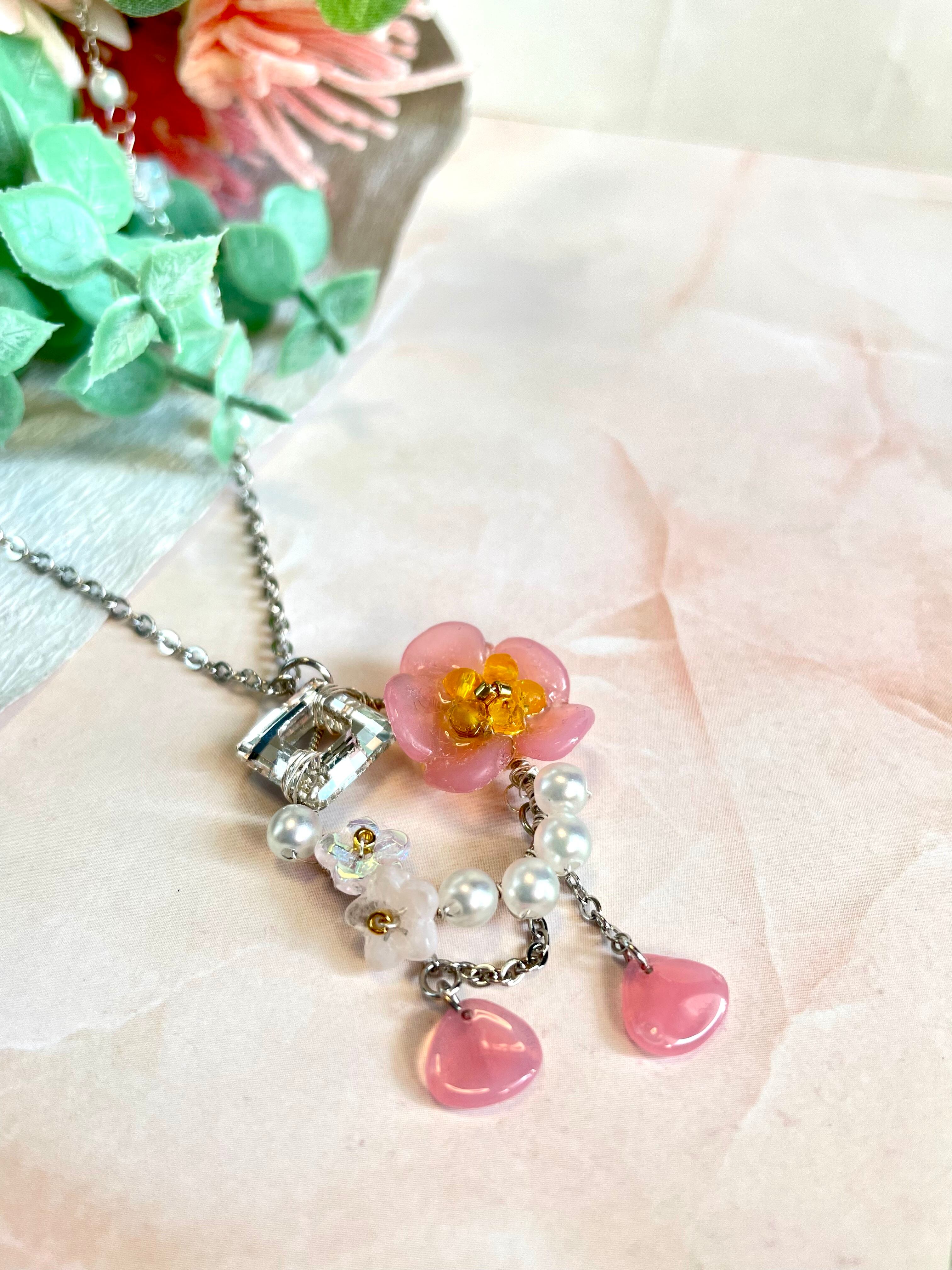 レジンでペタルビーズを束ねて大きな花を作りました。垂らしたペタルビーズは散った花びらをイメージしています。