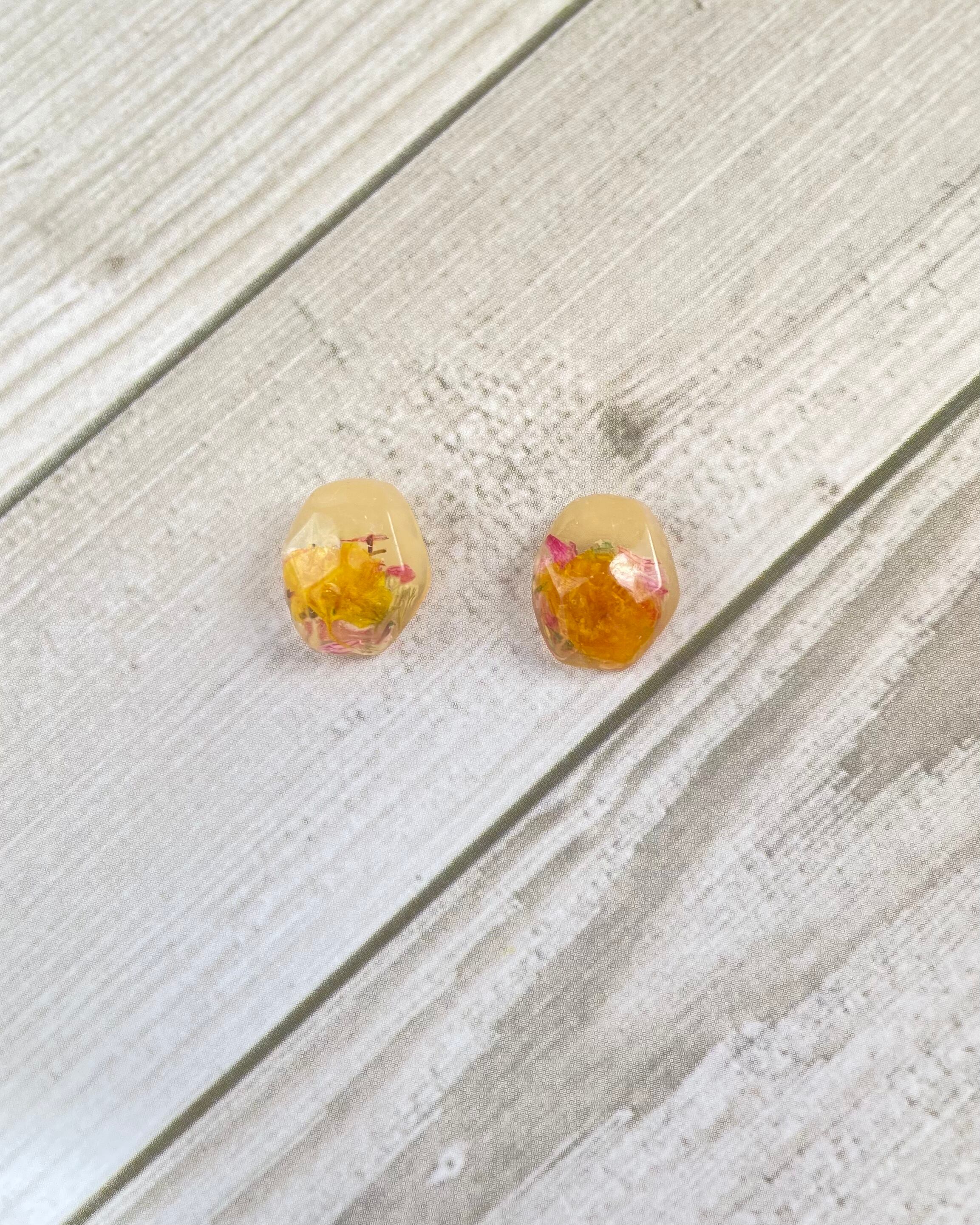 黄色のお花と、暖色系のドライフラワーを封入した鉱物の様な形の可愛い耳飾りです。レジン液を使用して、丁寧に仕上げました。