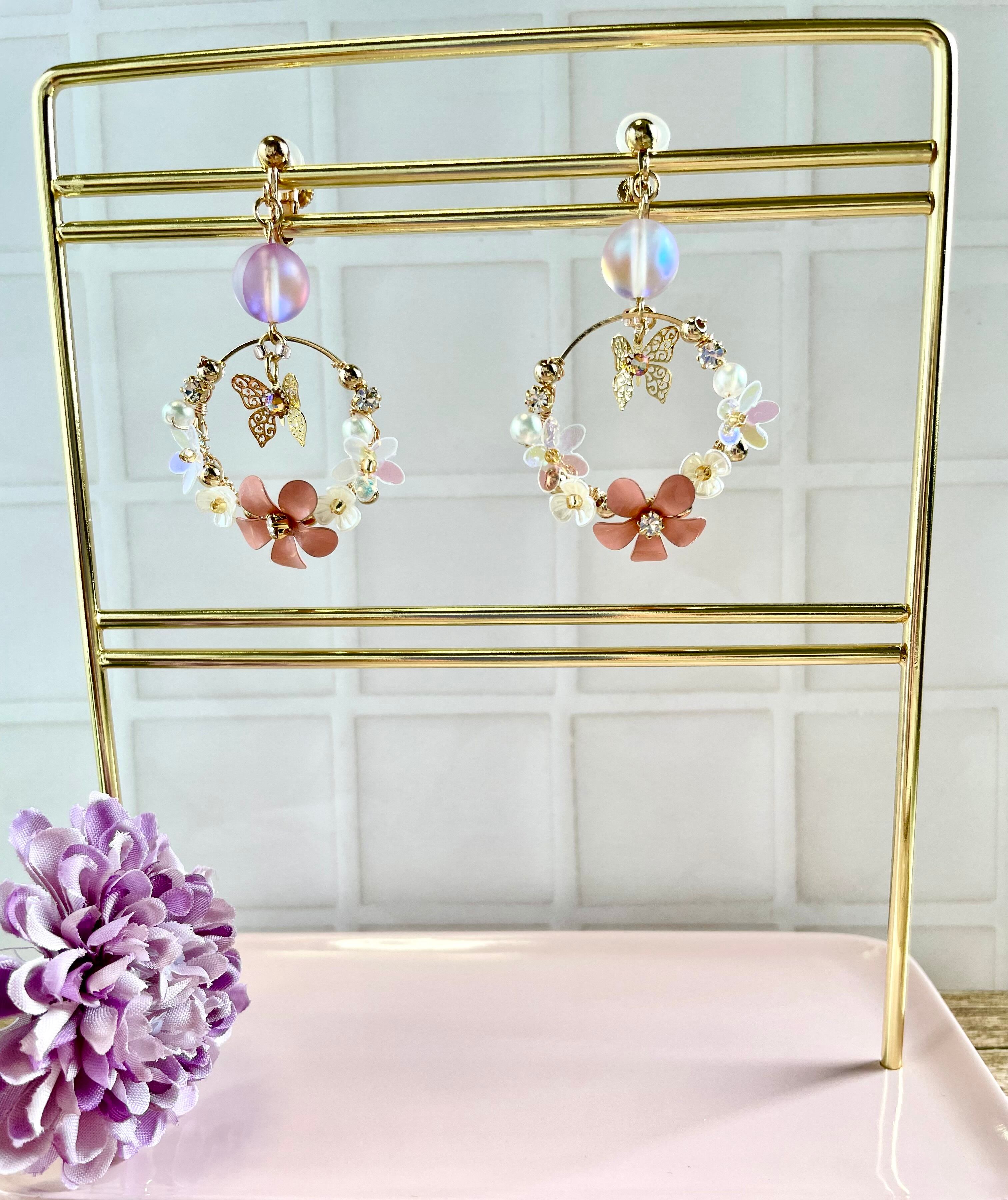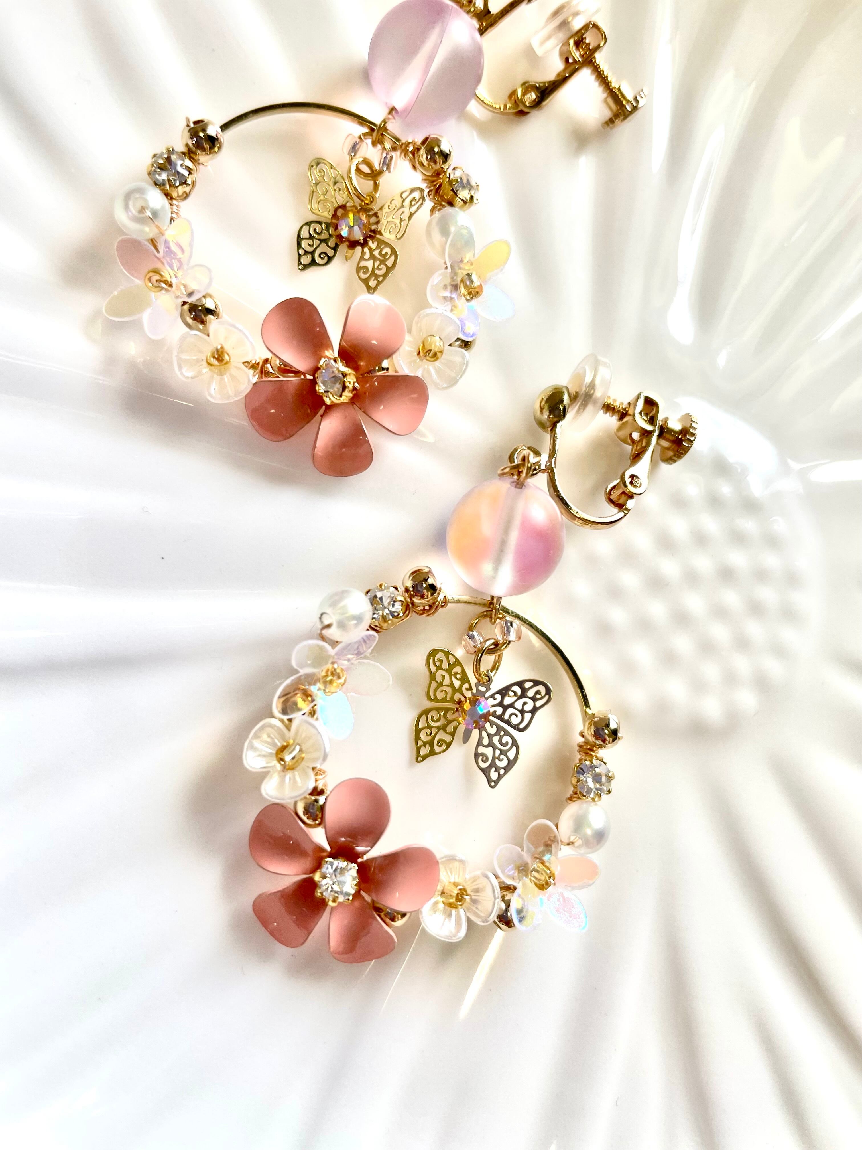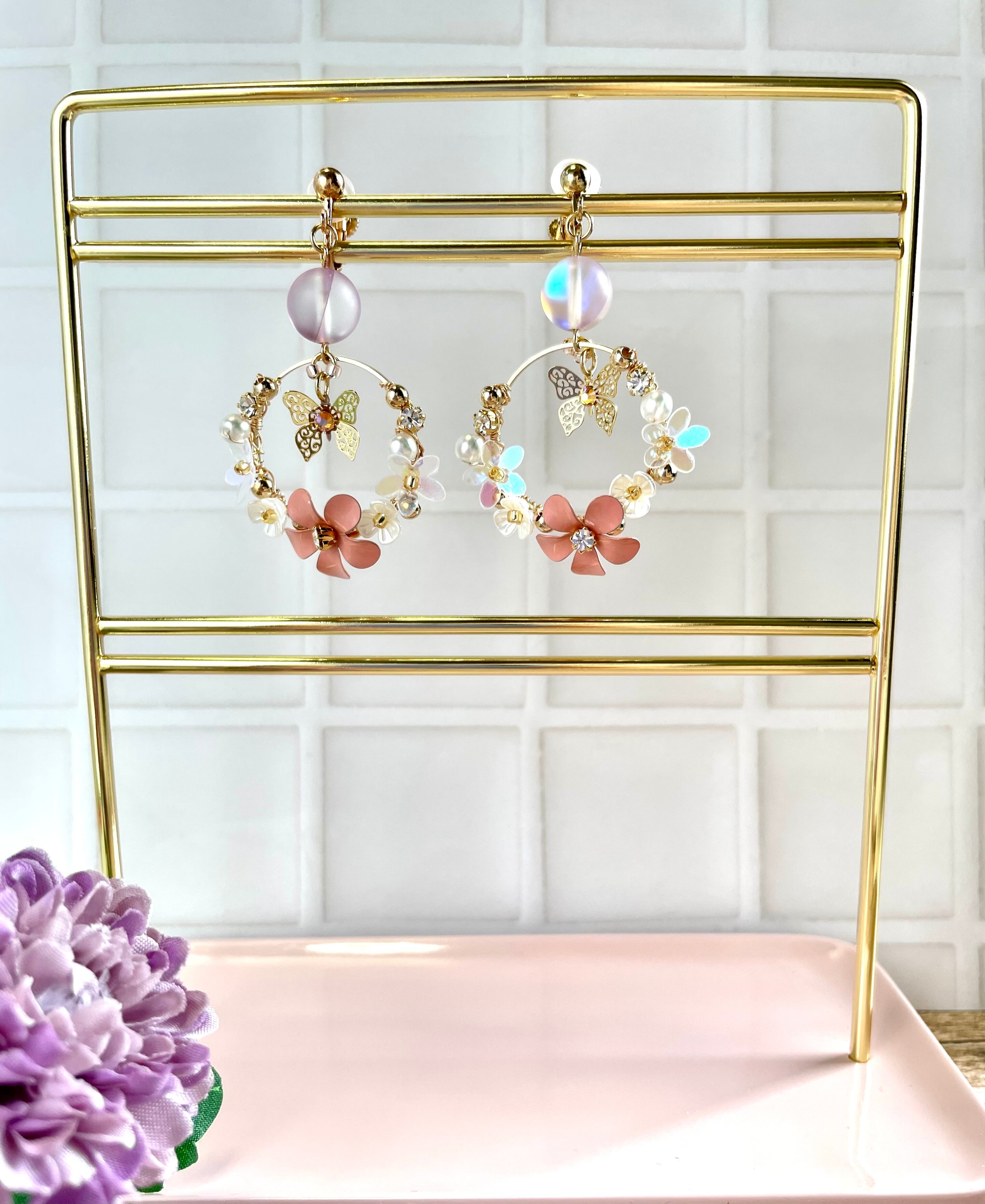 ゴールド色のフープにピンクのメタルフラワーをはじめ、お花シェイプのビーズ、パール、メタルビーズ、スパンコールなどをワイヤーで巻き付けて留めております。