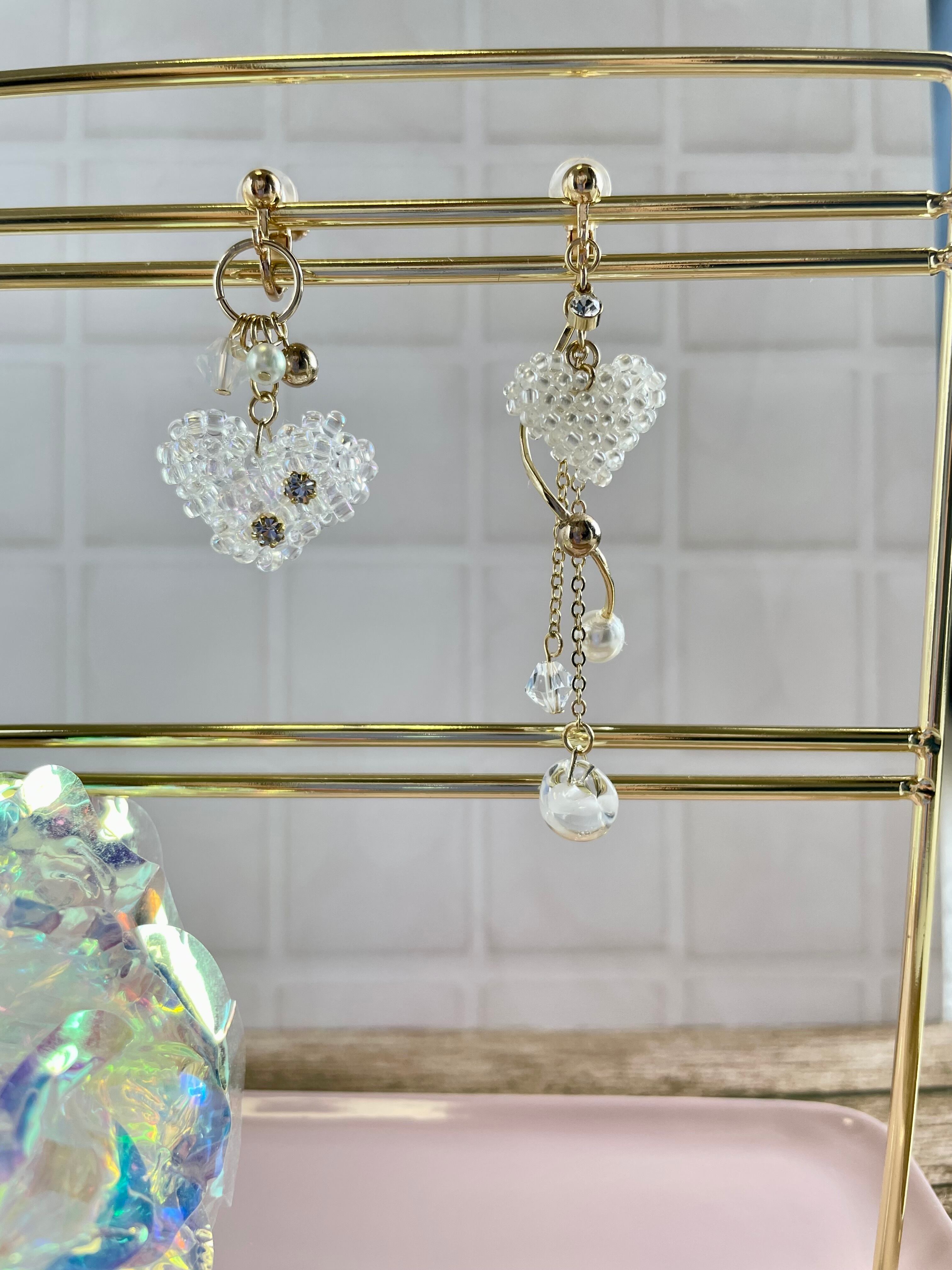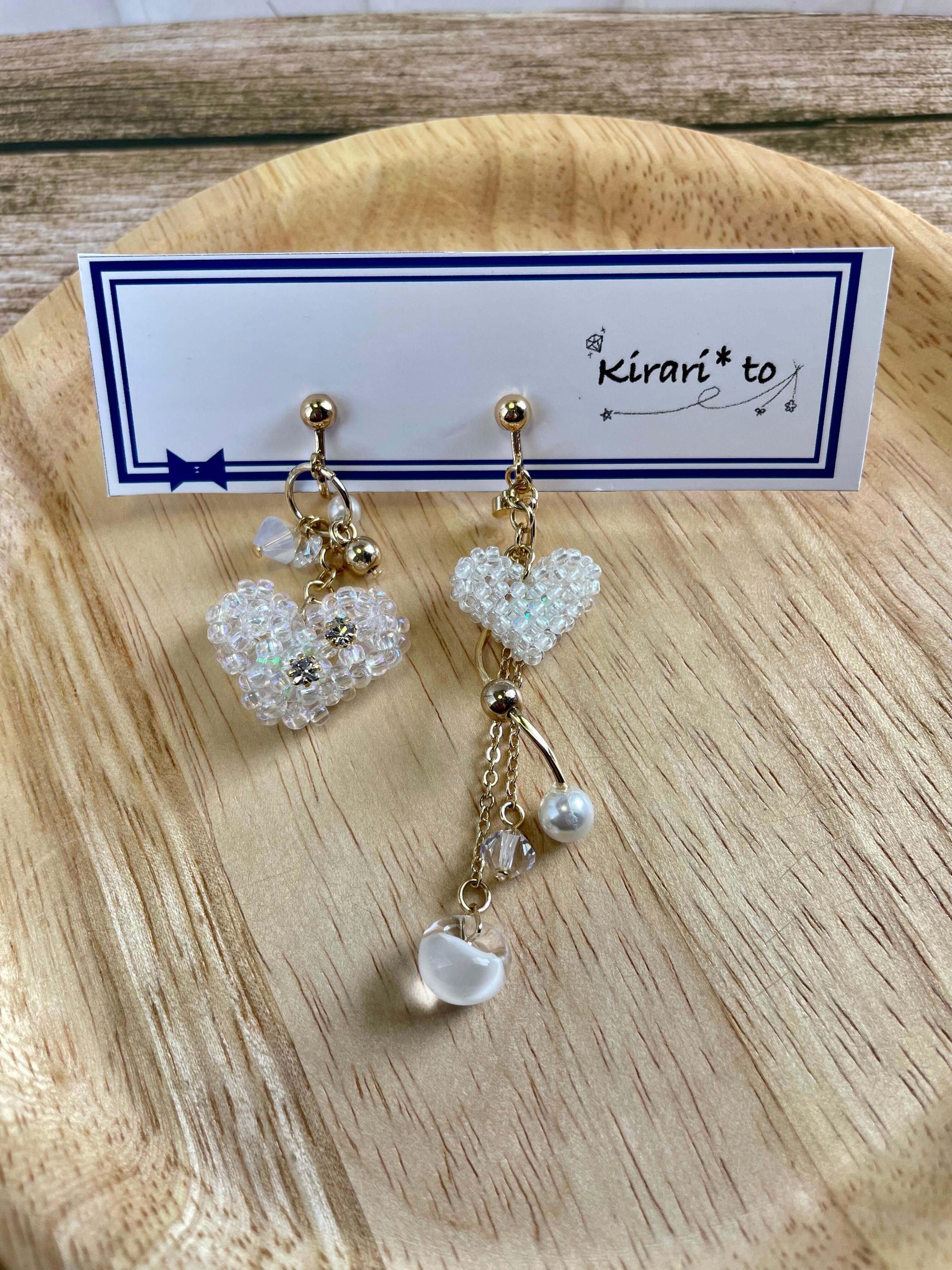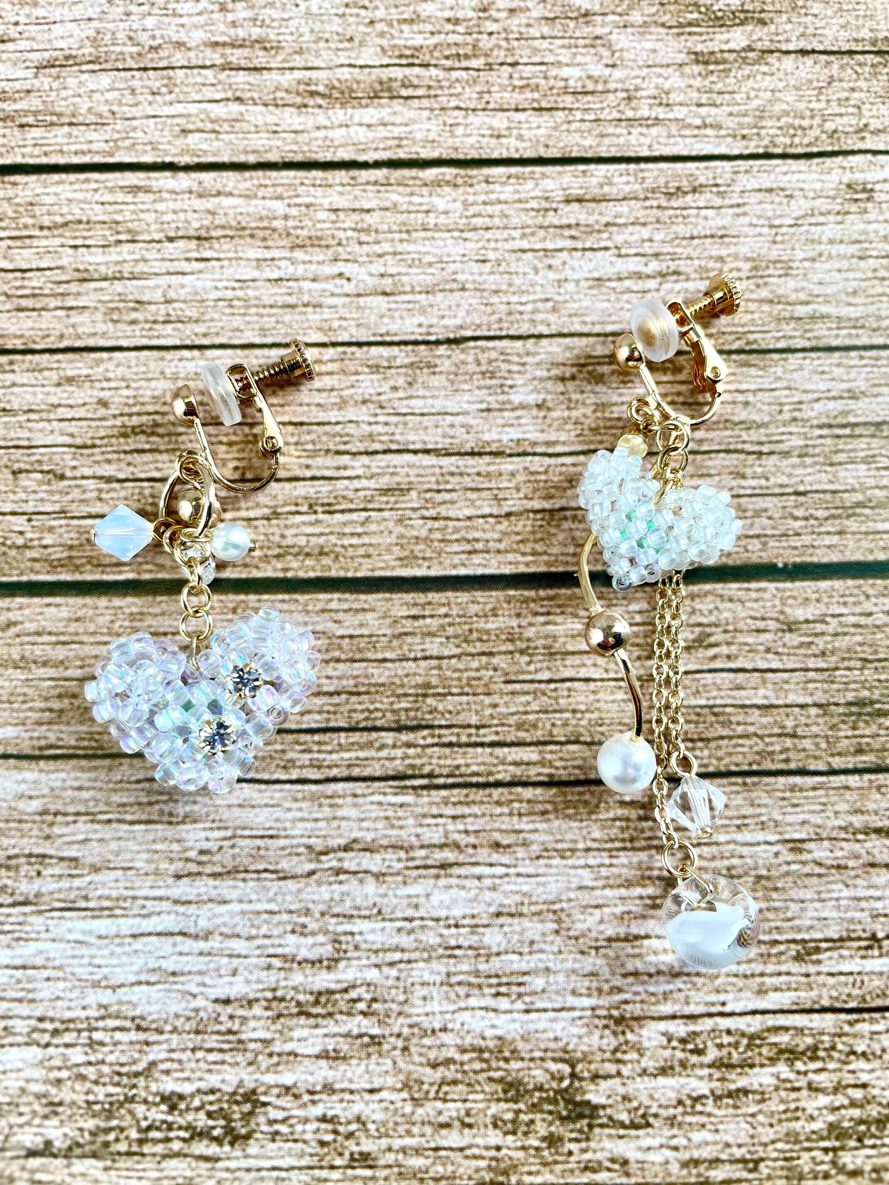 ビーズで編んだハートモチーフが特徴の可愛らしいイヤージュエリーです。